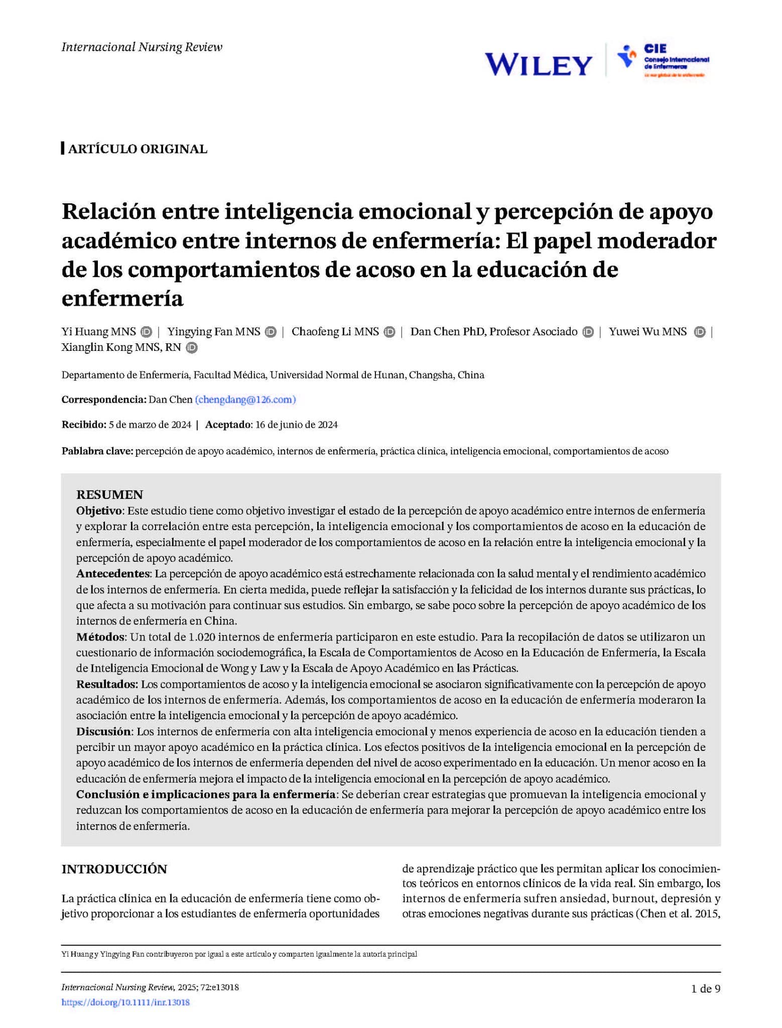 Relación entre inteligencia emocional y percepción de apoyo académico entre internos de enfermería: El papel moderador de los comportamientos de acoso en la educación de enfermería