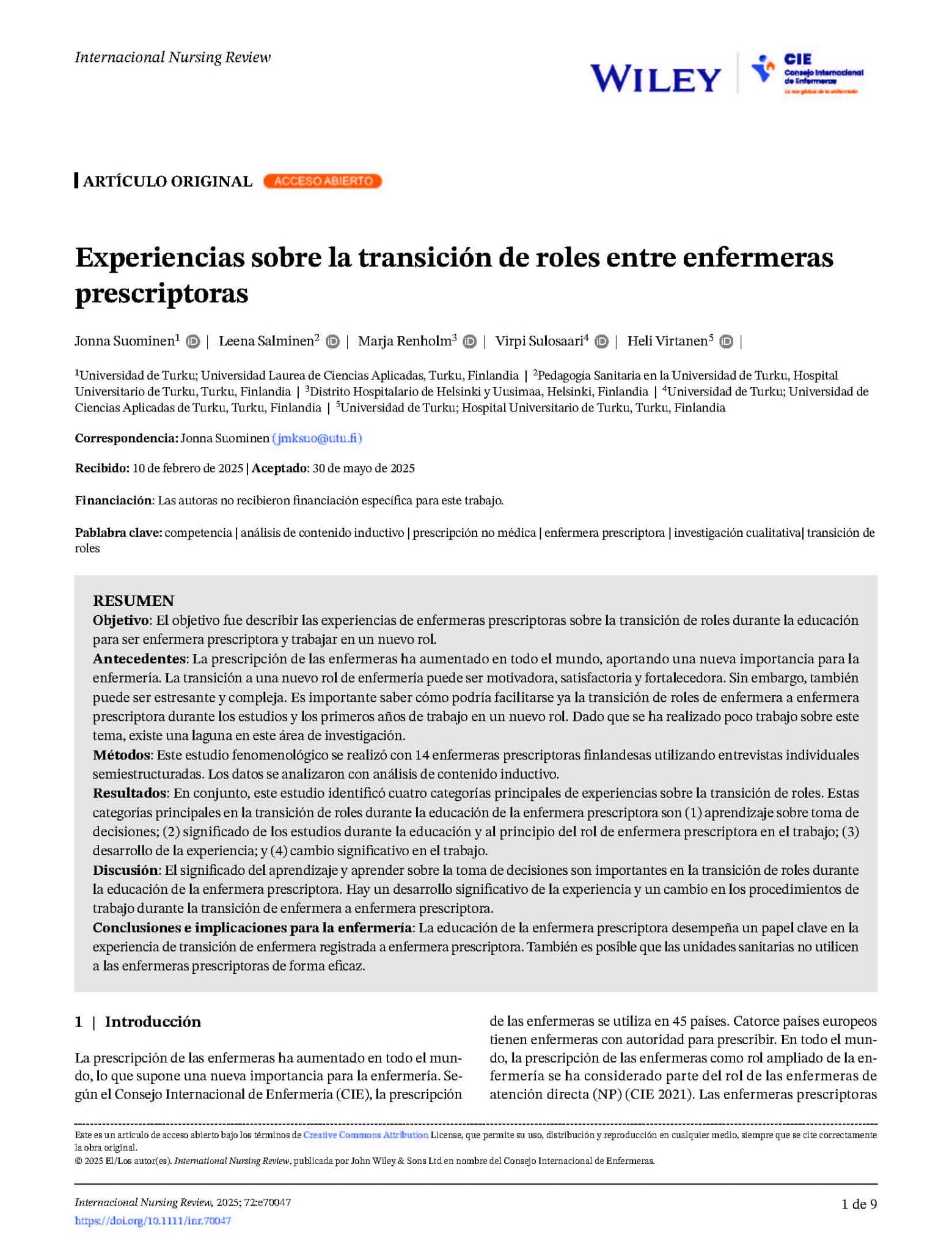 Palabras clave: Competencia, análisis de contenido inductivo, prescripción no médica, enfermera prescriptora, investigación cualitativa, transición de roles