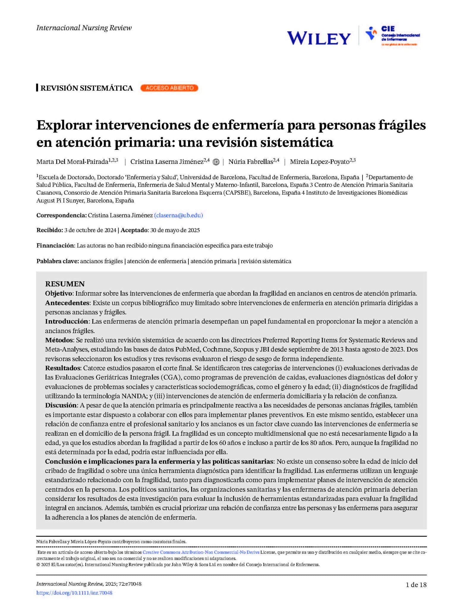 - Escuela de Doctorado, Doctorado ‘Enfermería y Salud’, Universidad de Barcelona, Facultad de Enfermería, Barcelona, España
