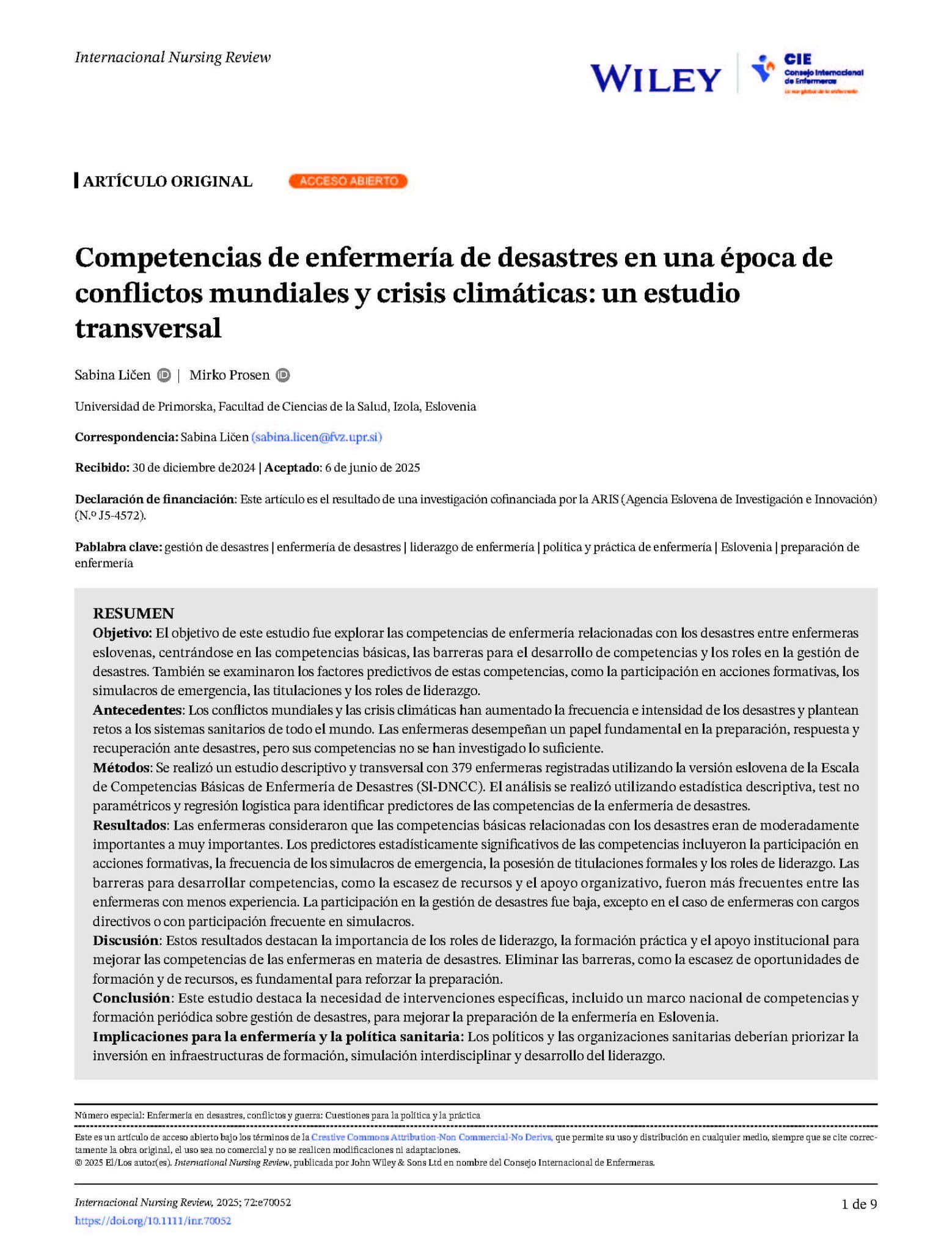 Palabras clave: Gestión de desastres, enfermería de desastres, liderazgo de enfermería, política y práctica de enfermería, Eslovenia, preparación de enfermería